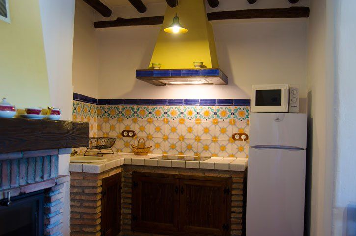 A través de un porche realizado con pizarra autóctona se accede a esta encantadora casa rural de cuidada decoración y distribuida en dos plantas. En la planta baja se encuentra un salón con chimenea y, en un recodo de este, se haya una coqueta cocina con mobiliario realizado en ladrillo viejo y puertas de madera, y en cuyo alicatado se han empleado azulejos elaborados y pintados a mano.