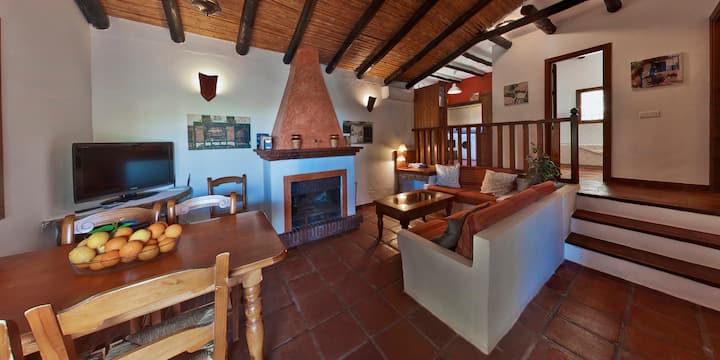 Esta casa dispone de dos amplios dormitorios; el dormitorio principal con una cama doble ( 1.35 m ) y el otro con dos camas individuales de 1.05 m, salón comedor con chimenea, aire acondicionado, cocina totalmente equipada y un baño completo.