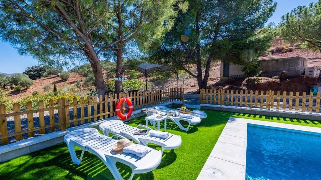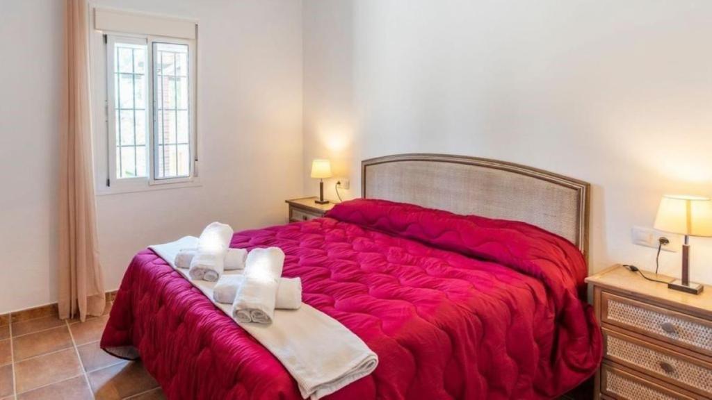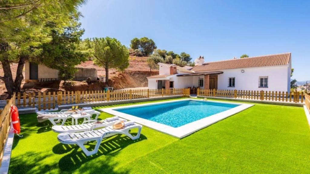 Cuenta con un patio con vistas a la piscina vallada y un amplio jardín con barbacoa y zona de solárium con tumbonas.