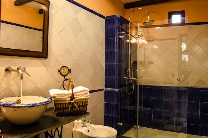 On the upper floor there is a terrace with magnificent views of the town and the region and three large double bedrooms decorated with care, one of them with a double bed and the other two with two 105 cm beds. A spacious bathroom, built on two levels, with a marble countertop, sinks made with handmade ceramic basins and a built-in bathtub, completes the rooms on this floor.