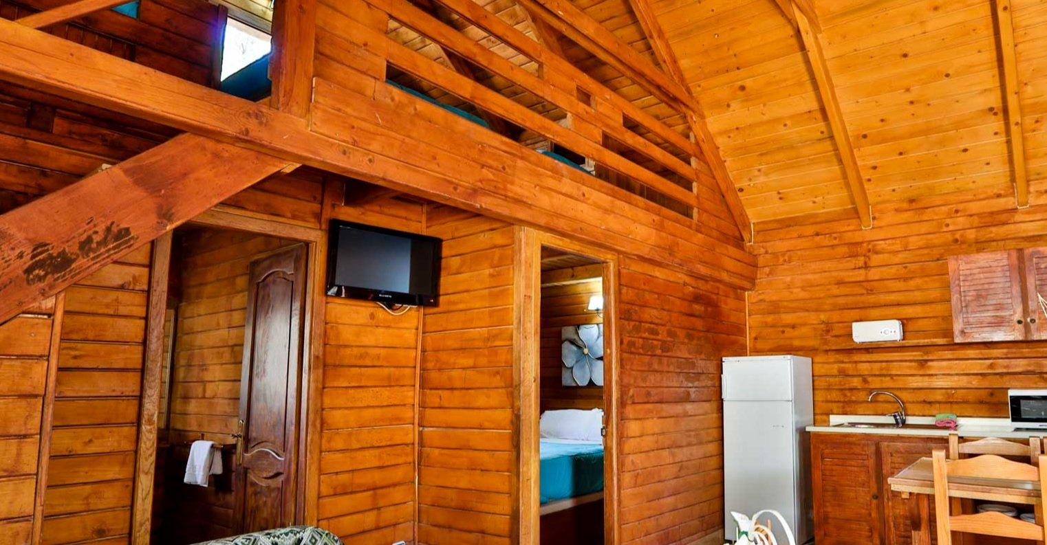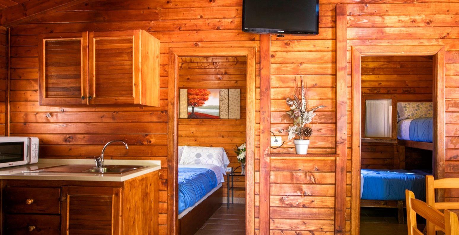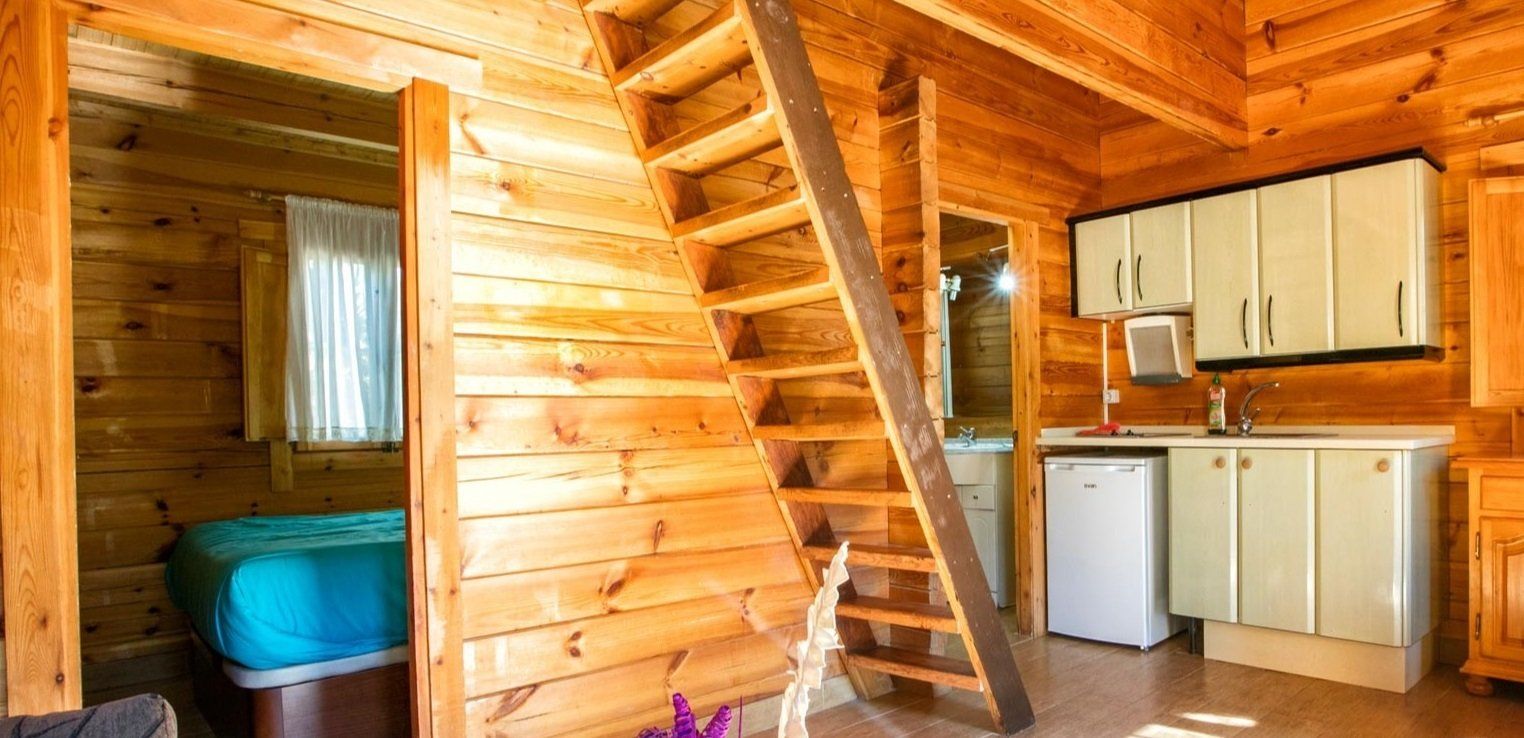 Cabins with 1 bedroom loft for 3 people, kitchen with living room, bathroom, air conditioning and heating.