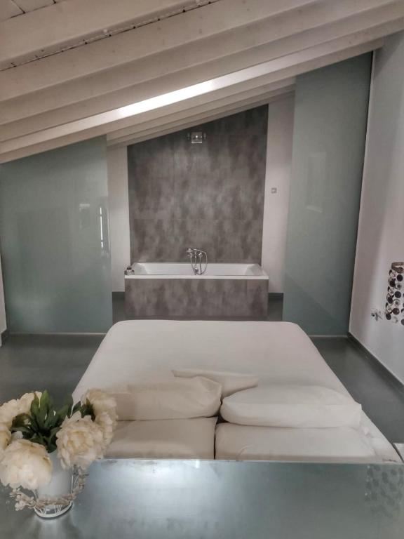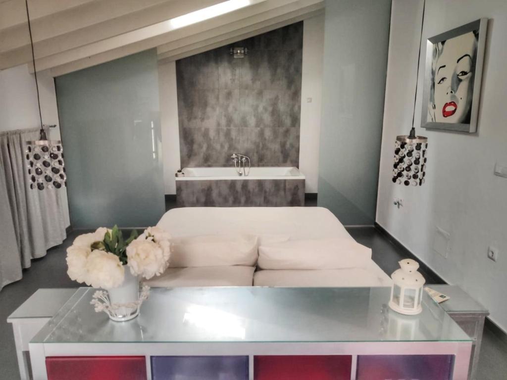 One of them is 50 m2, an open space, with functional, warm and stylish decoration, consisting of a double bed, sofa with table, high table with chairs, kitchen and open bathroom with bathtub for two people.