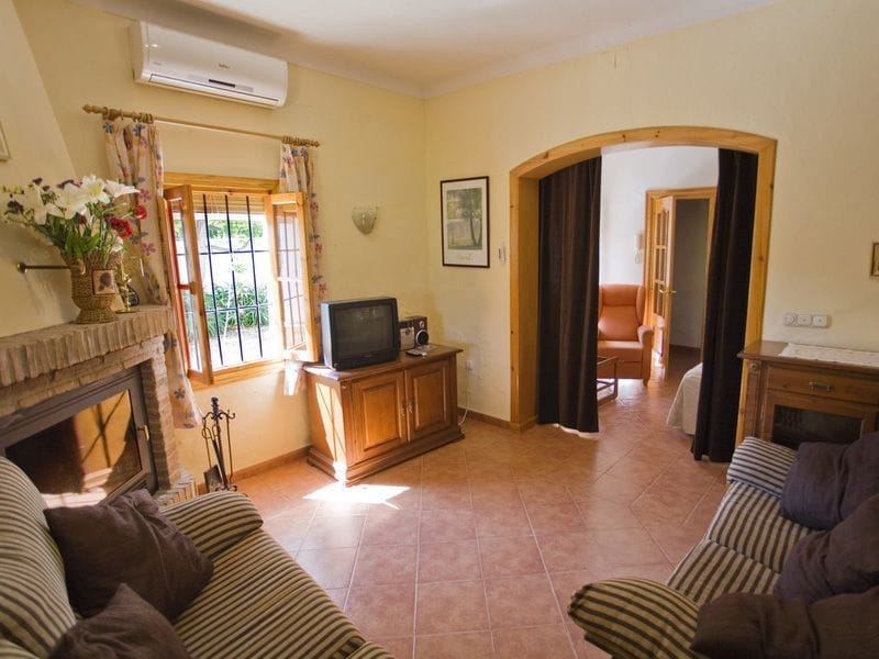 - Living room, spacious and full of light. As a rustic touch, it has a fireplace on the corner, next to which there are 2 comfortable sofas. The modern point is put by the audiovisual equipment, consisting of a flat-screen TV with DVD, and a stereo.