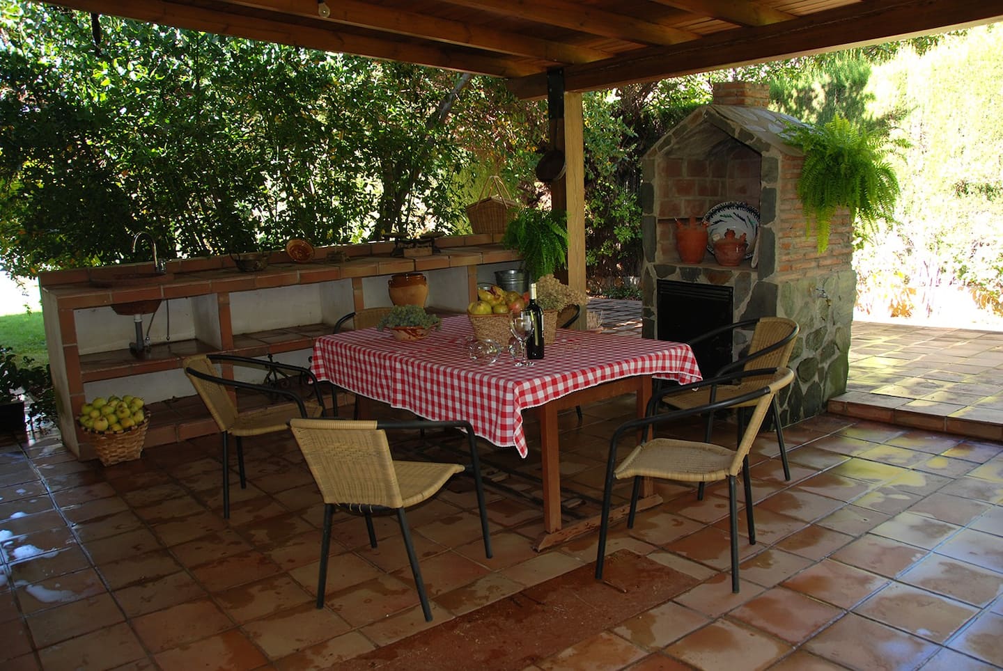 Uno de ellos, el trasero con barbacoa, fregadero, encimera de obra, así como mobiliario para disfrutar de la comida al aire libre.