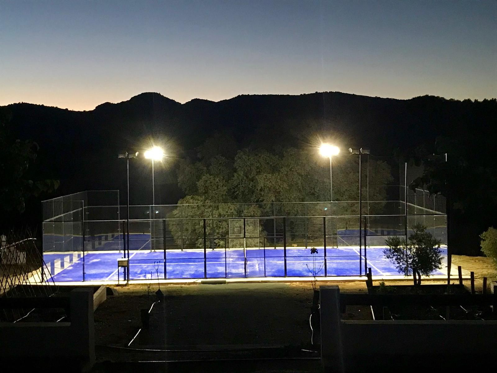 Pista de padel en el recinto con luz para jugar por la noche.