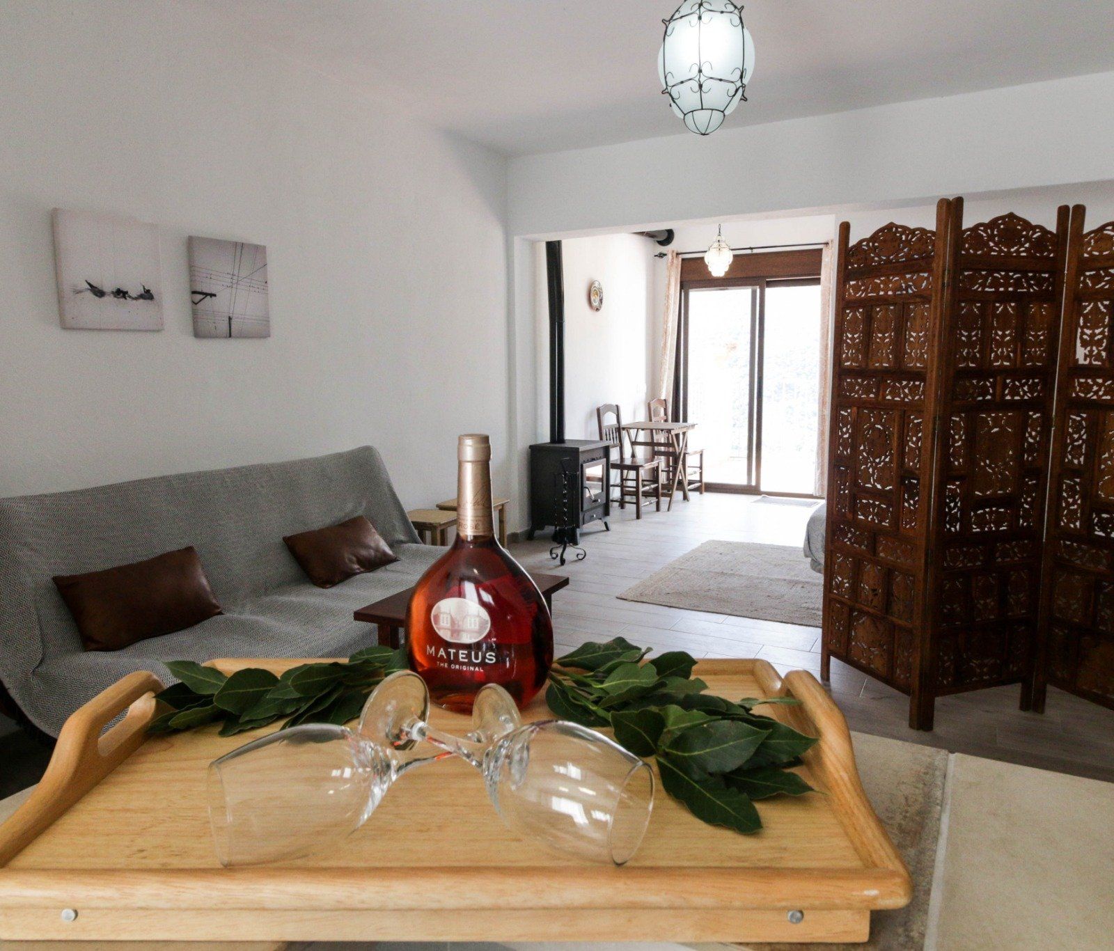 É um loft rústico-industrial de 50m2 com capacidade para três pessoas, casa de banho, terraço e piscina.